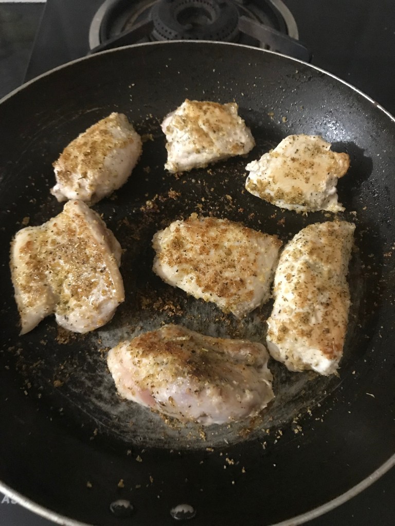 - Sear chicken pieces and season with salt & pepper. You can also season with other spices that you have, like peri peri mix or italian seasoning.