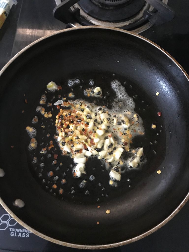 - Add chopped garlic & 1 pack of chilli flakes and fry until golden brown