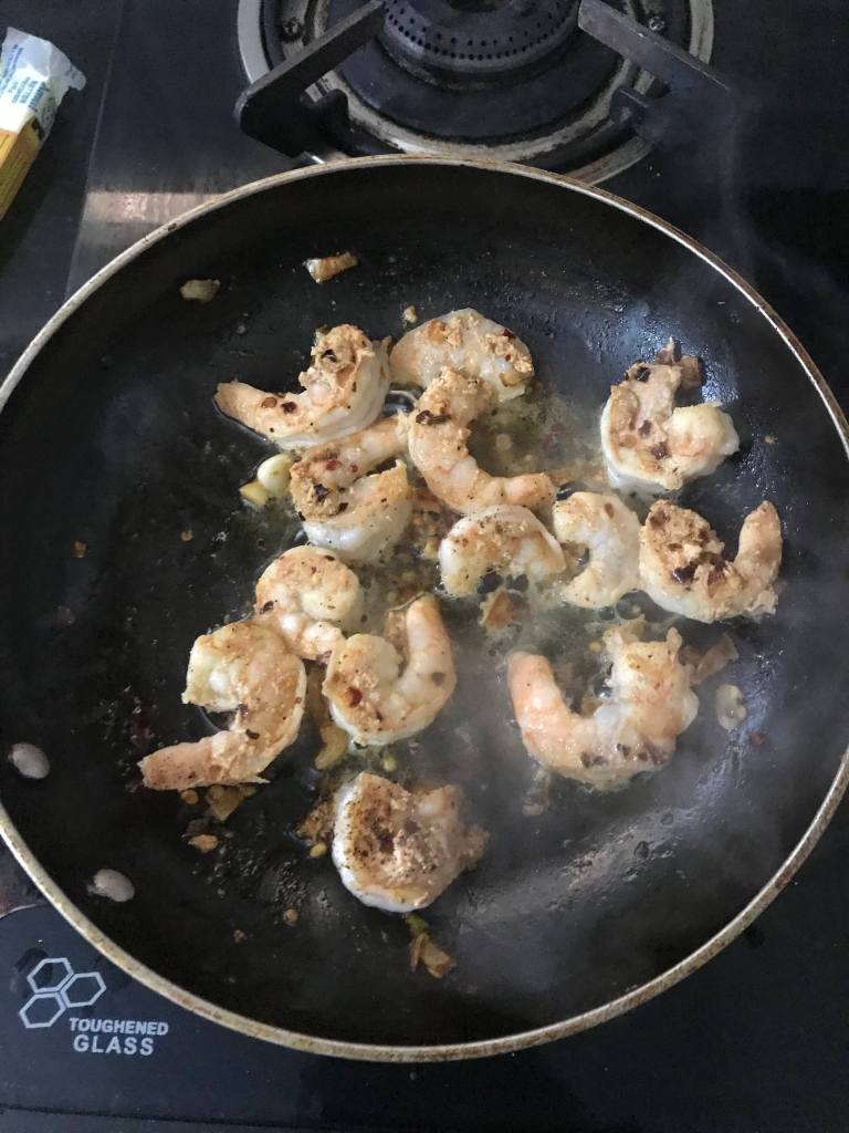 - Add prawn, salt & pepper and stir until prawn becomes slightly pink but not completely cooked