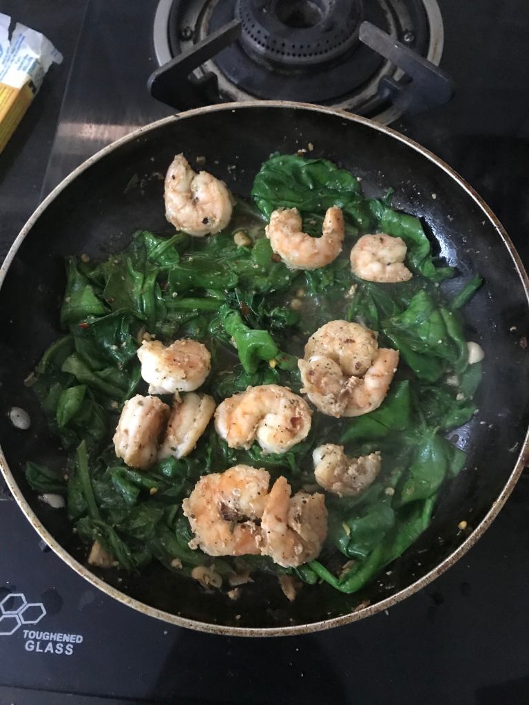 - Add your spinach & oregano and stir until its wilted. Take out your prawns if you feel like spinach is taking too long to cook, so that your prawns don’t get overcooked