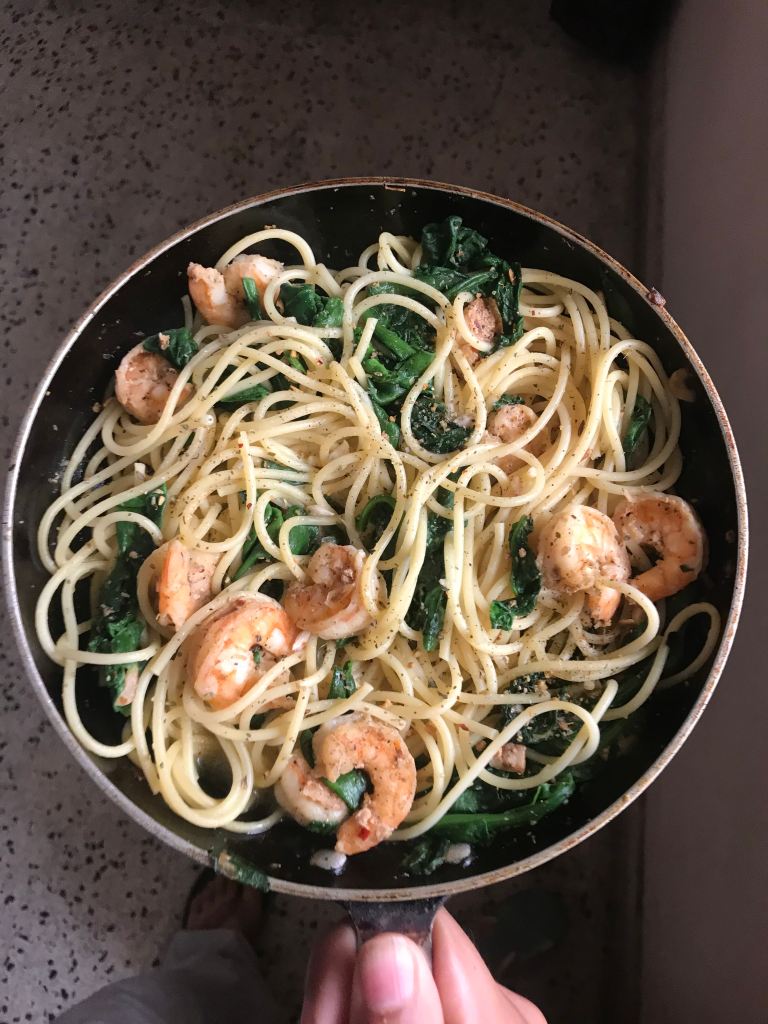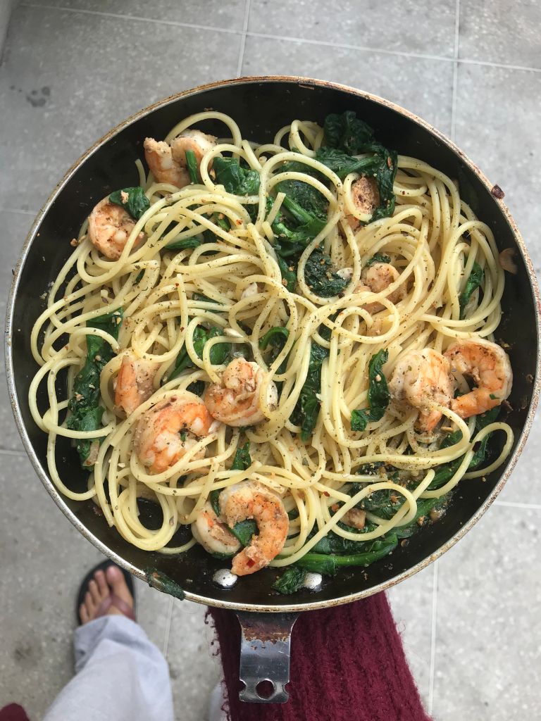 So my flatmate Janaki showed me this Tasty video of this recipe and like all Tasty videos, it looked soooooo tasty and so easy! Since I already had prawns at home (smaller version of shrimp) I decided to try this on a Saturday afternoon. I’m not a fan of pasta, I always feel like it’s too carb-heavy. But this one is so light & fresh – it’s perfect for a summer lunch! It’s also fairly quick, so if you have a sudden craving, or suddenly people come over – wow them with this juicy, fresh dish.
