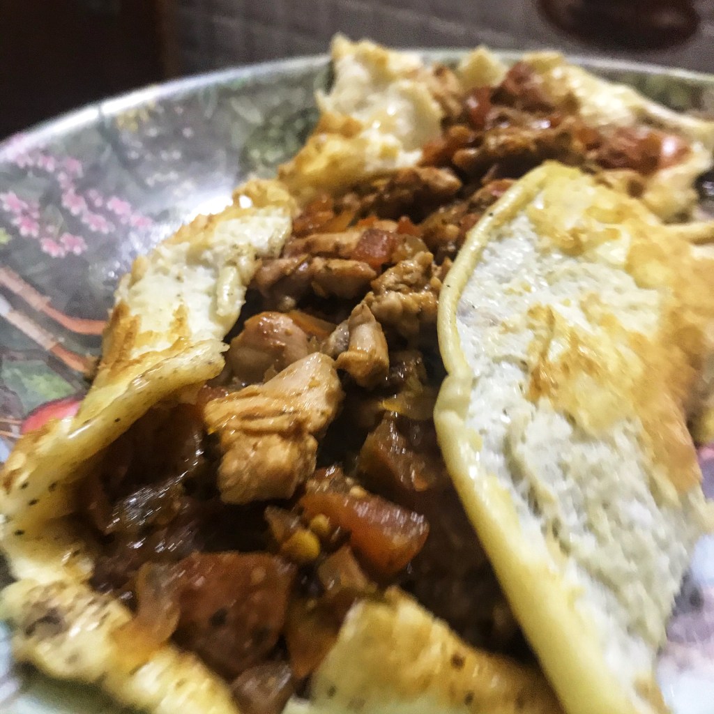 - Add the chicken AFTER the omelette is transfer from the pan to a plate. If you try adding it while in the pan, the omelette might break when you try to transfer it to a plate (I made this mistake and it was a giant mess lololol)