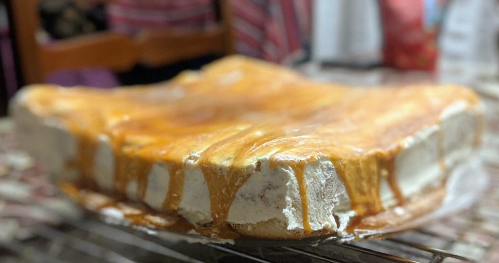 - Finally on top drizzle a whole lot of caramel. Then (and this is really important for the marble effect) slowly spread the caramel in gentle left-right motions so you get the marbled effect pat down.
