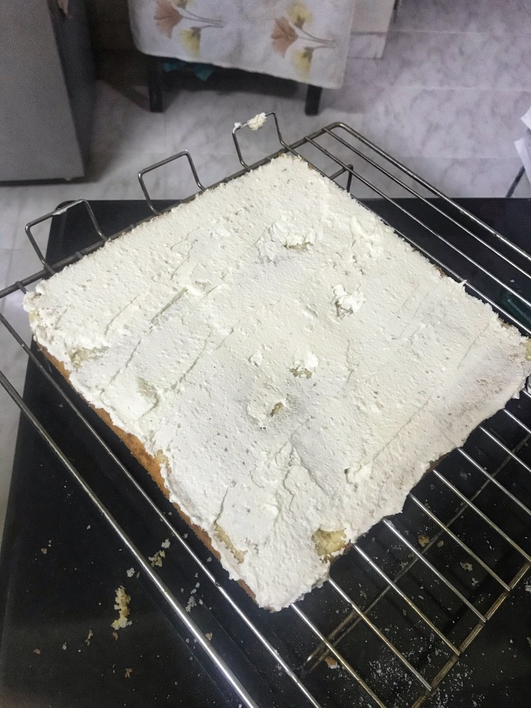 - Cover the bottom layer of the cake with buttercream, smoothing it out well with a spatula/back of a spoon if you don’t have a spatula. Make sure you leave some space at the edges because if you fill it up too much then when put the top layer it all gets squished out