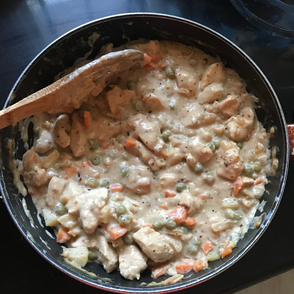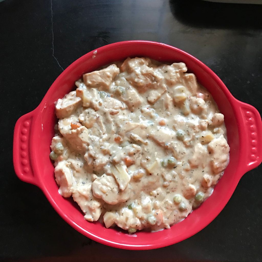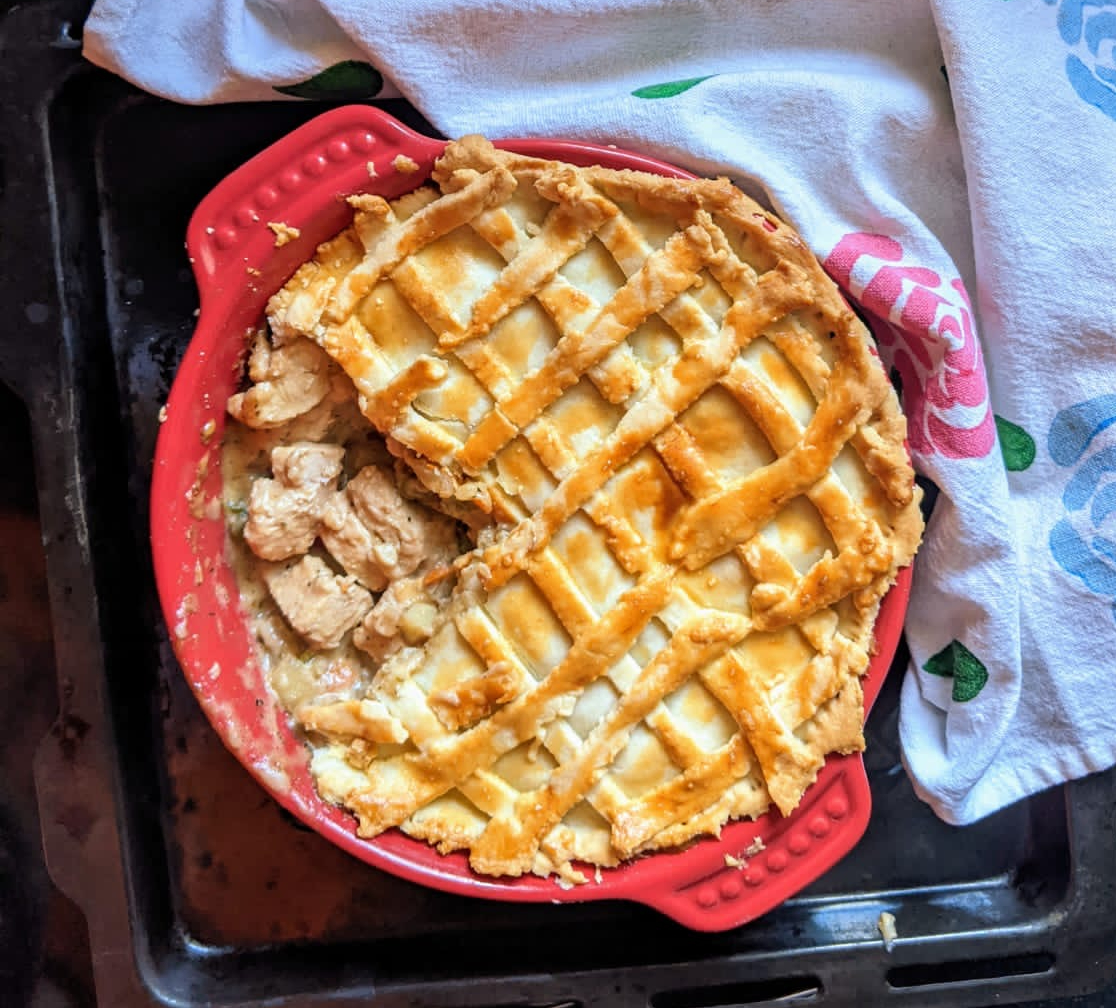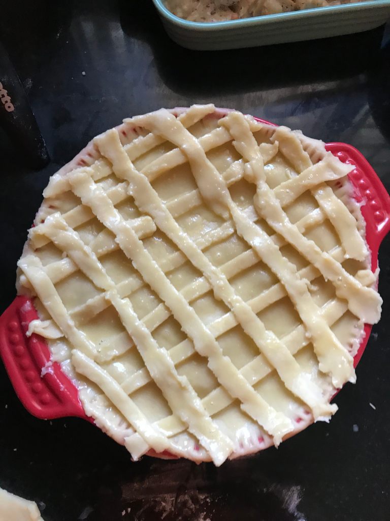 - Pour into a baking dish and cover with rolled-out cold pie crust, sealing the edges