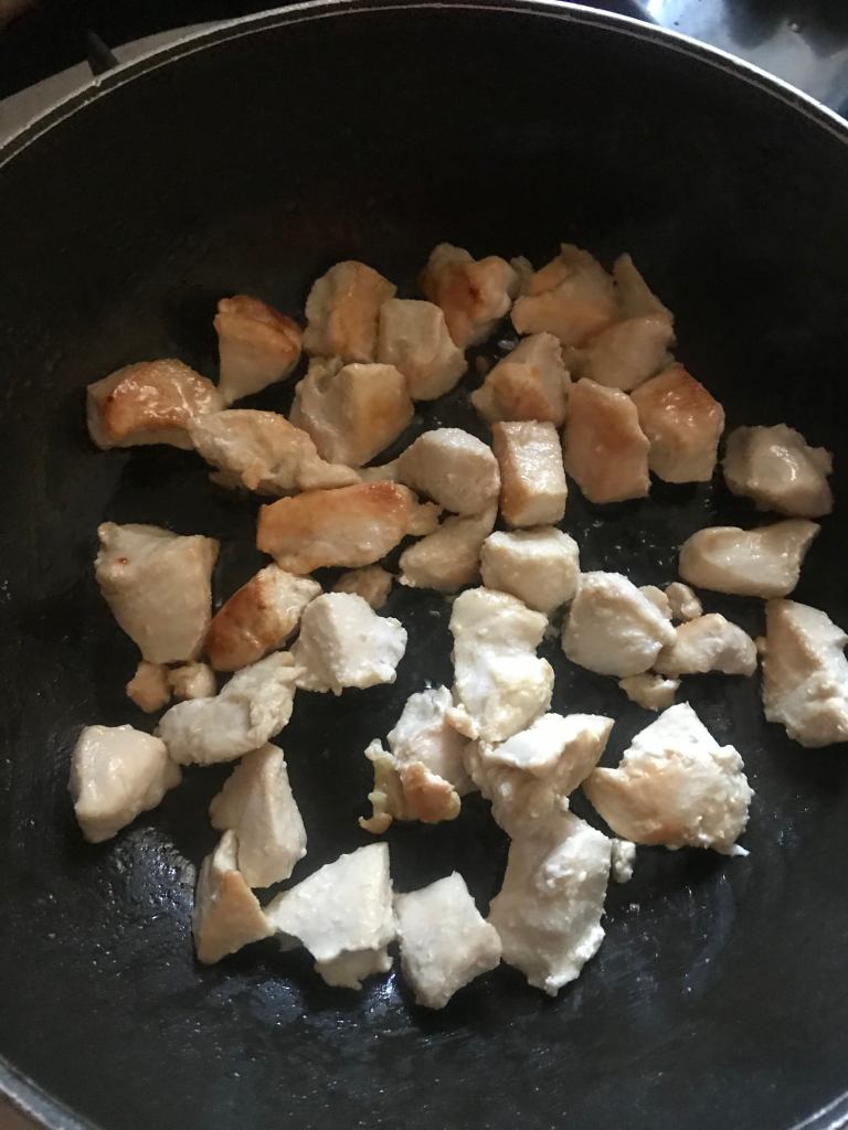 - While that’s cooking, chop chicken into bite-sized pieces (skip if veg)