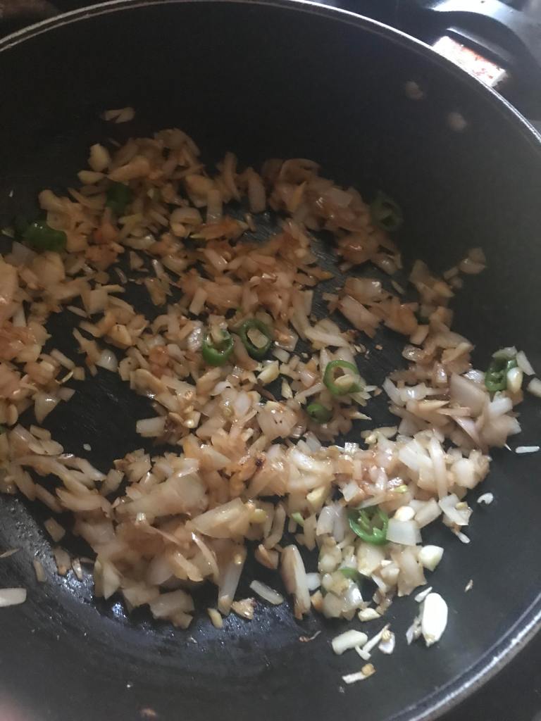 - Keep chicken aside (don’t throw away the butter!) and in the same pan cook chopped garlic, chillies & onions with brown sugar until golden brown