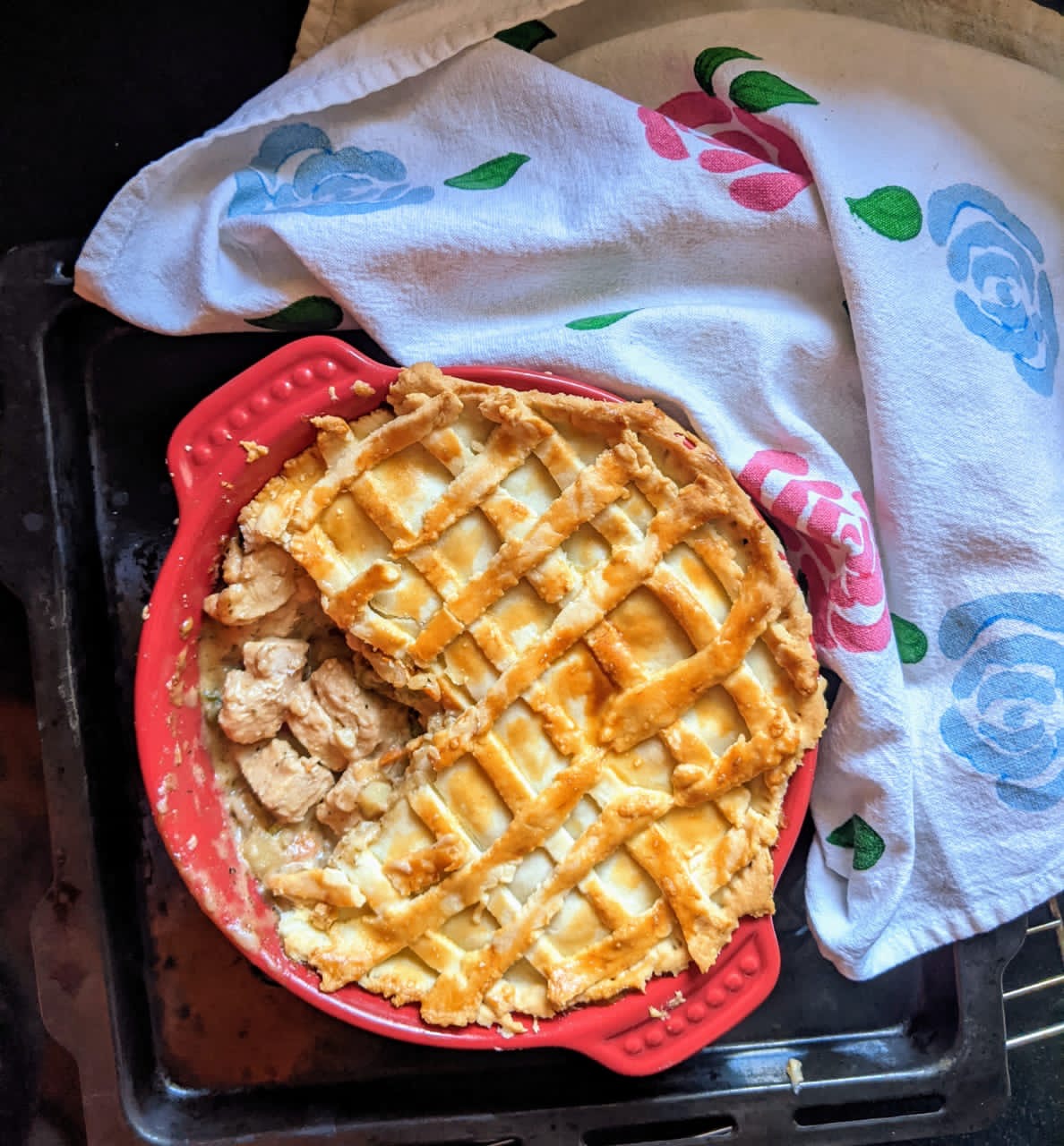 - Pour into a baking dish and cover with rolled-out cold pie crust, sealing the edges