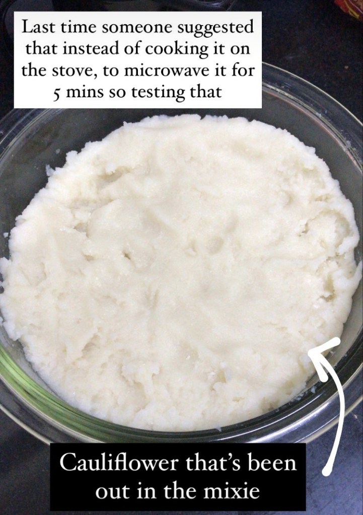- You might have to make the cauliflower paste in batches, in case you have a small mixie. Whenever done, put it in a microwave-safe bowl