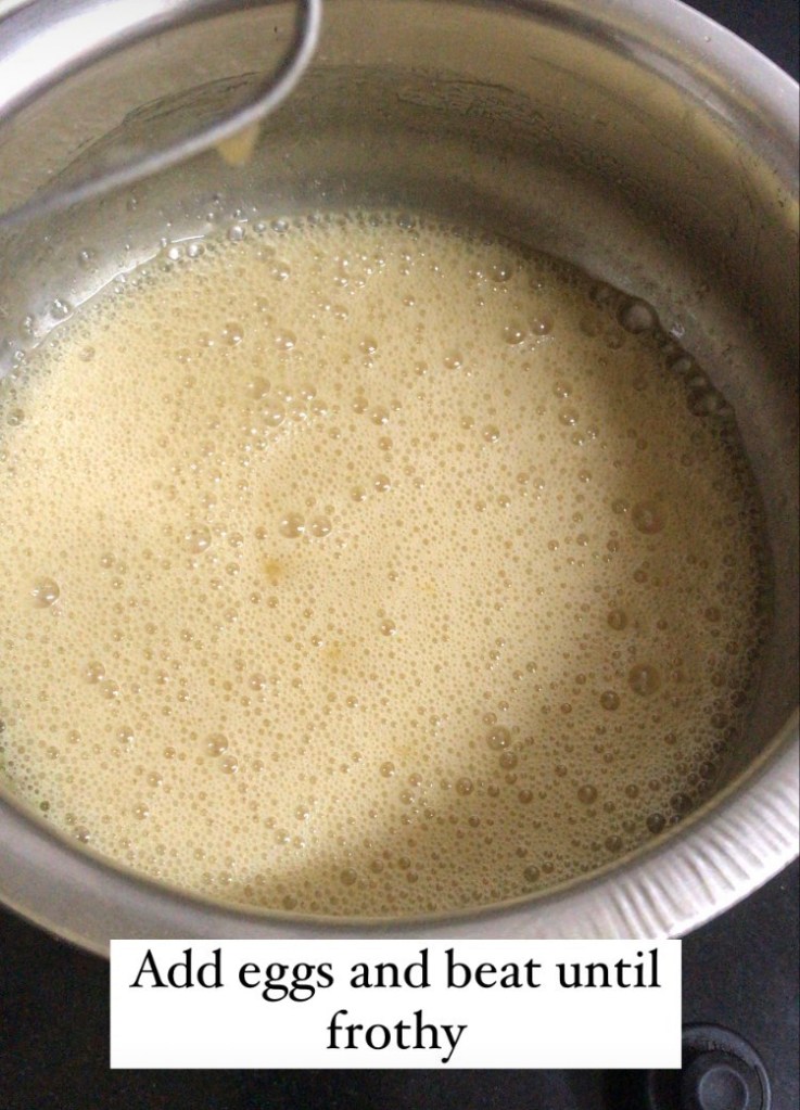 - Once the mixture cools down, add your eggs in one by one and whisk it until fluffy (make sure it’s cool otherwise you’ll get scrambled eggs lol)