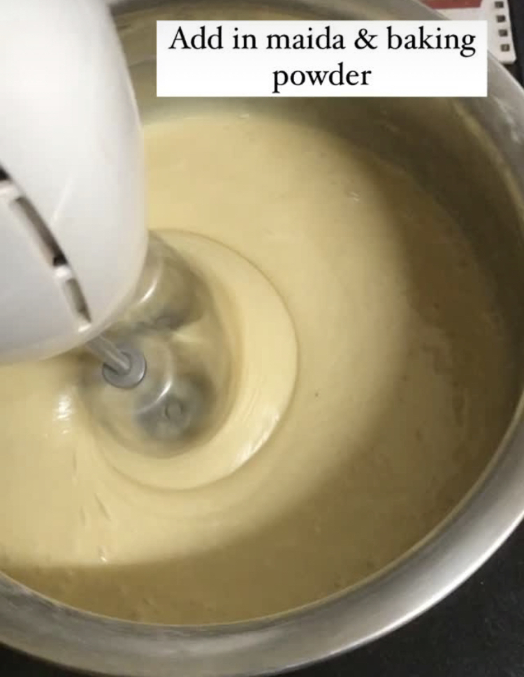 - In another bowl sieve in maida and baking soda, and then add the flour mix to the batter little by little