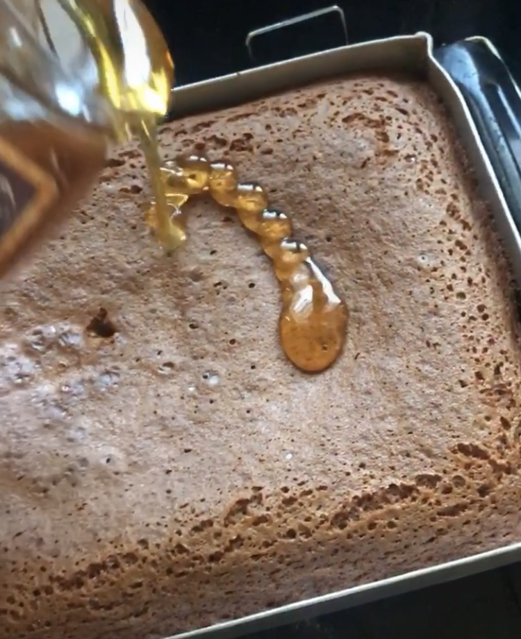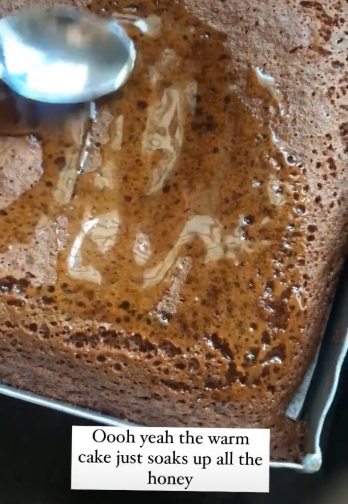 - While the cake is still hot, drizzle honey over the top – make sure you cover the entire top!